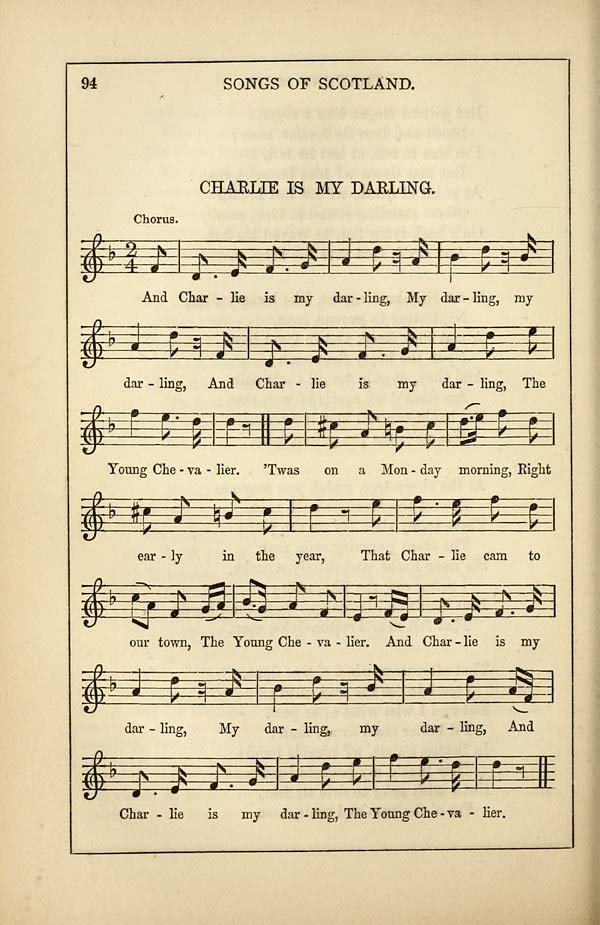 Twas On a Monday Morning. Right Early in the Year. When Charlie Came to Out Town. The Young Chevalier. Charlie Is My Darling, My Darling, My Darling. Charlie Is My Darling, the Young Chevalier. As He Cam' Marchin' Up the Street. The Pipes Played Loud and Clear. And A' the Folk Cam' Rinnin' Out.