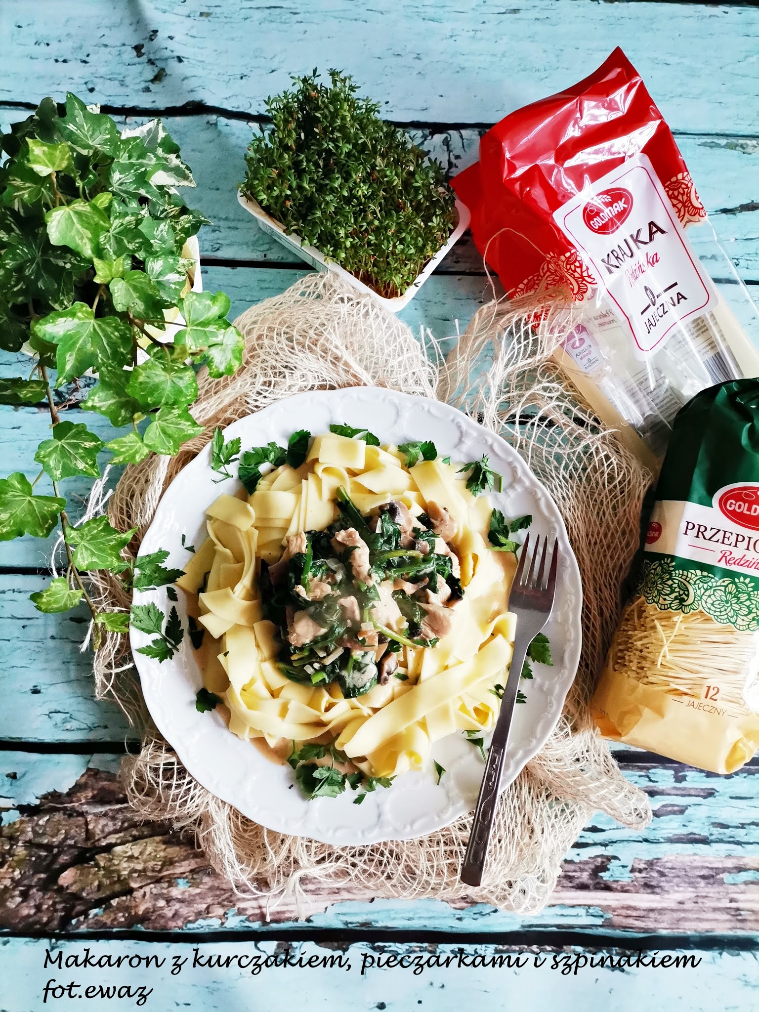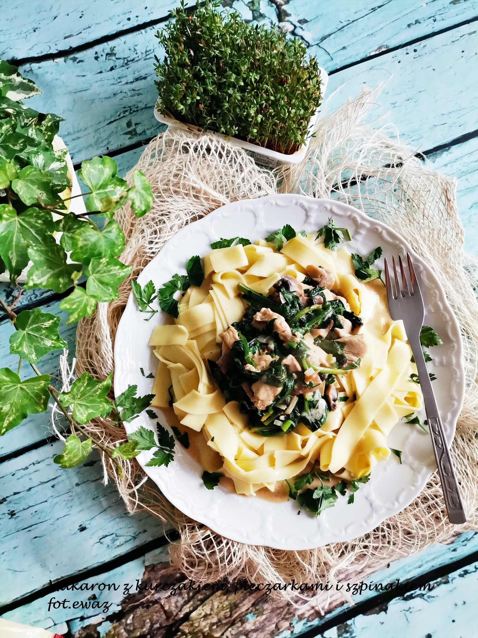 Ewa w kuchni Makaron z kurczakiem, pieczarkami i szpinakiem