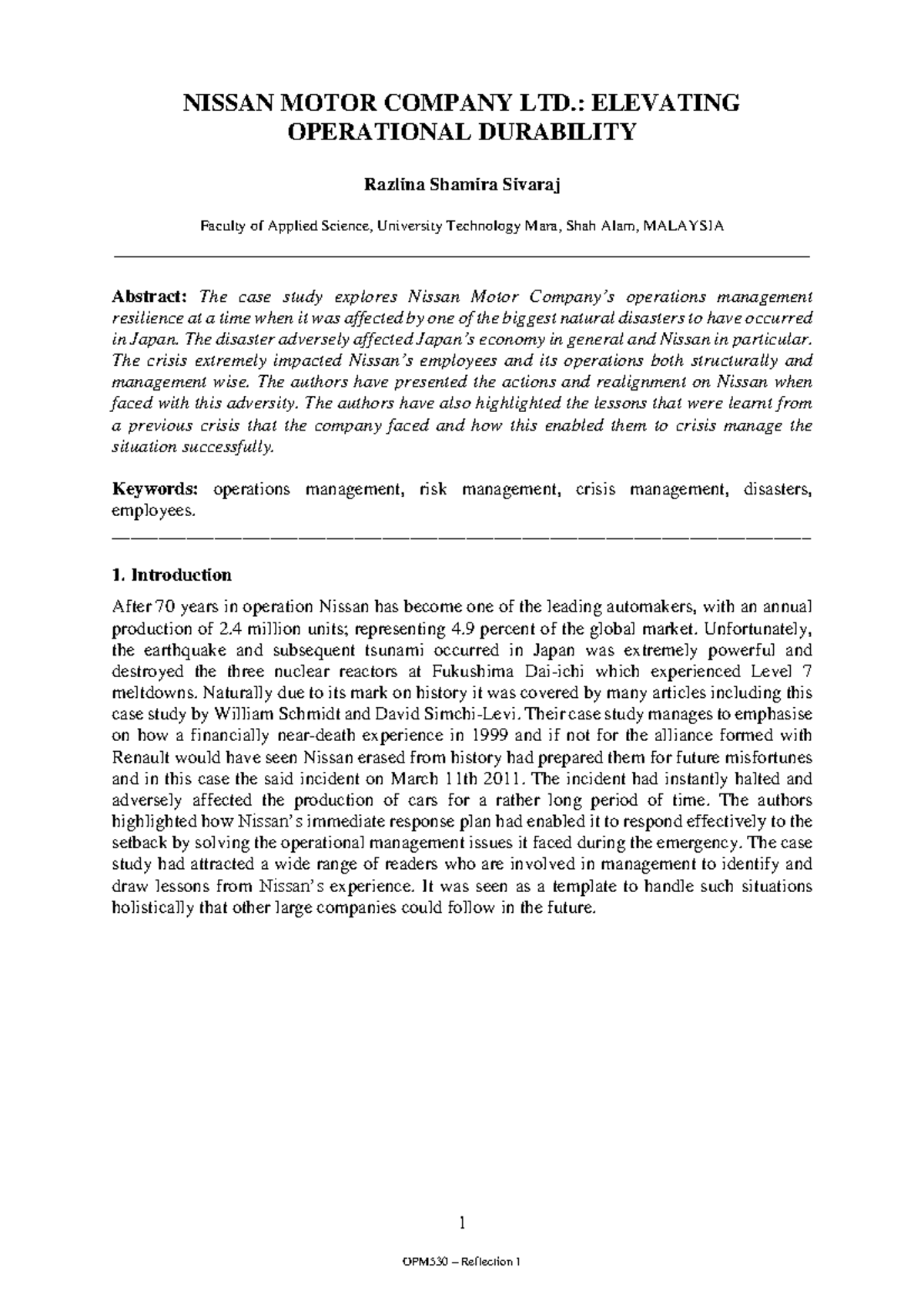 Article Review Nissan Motor Company Ltd 1 OPM530 Reflection 1 NISSAN MOTOR COMPANY LTD