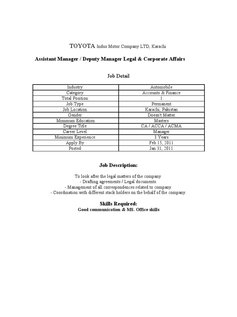 Indus Motor Company Ltd Jobs Assistant Manager Warehouse