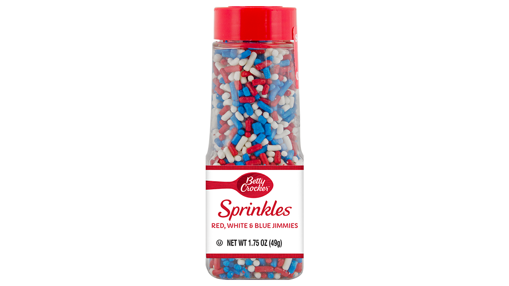 Betty Crocker™ Red, White & Blue Sprinkles. What better way to celebrate patriotic holidays than with red, white and blue sprinkles! It's a fun and delicious way to embellish your favorite cupcakes, cakes, cookies, or other sweet treats. These are perfect for small Memorial Day get-together and big July 4th blowouts! celebrations.