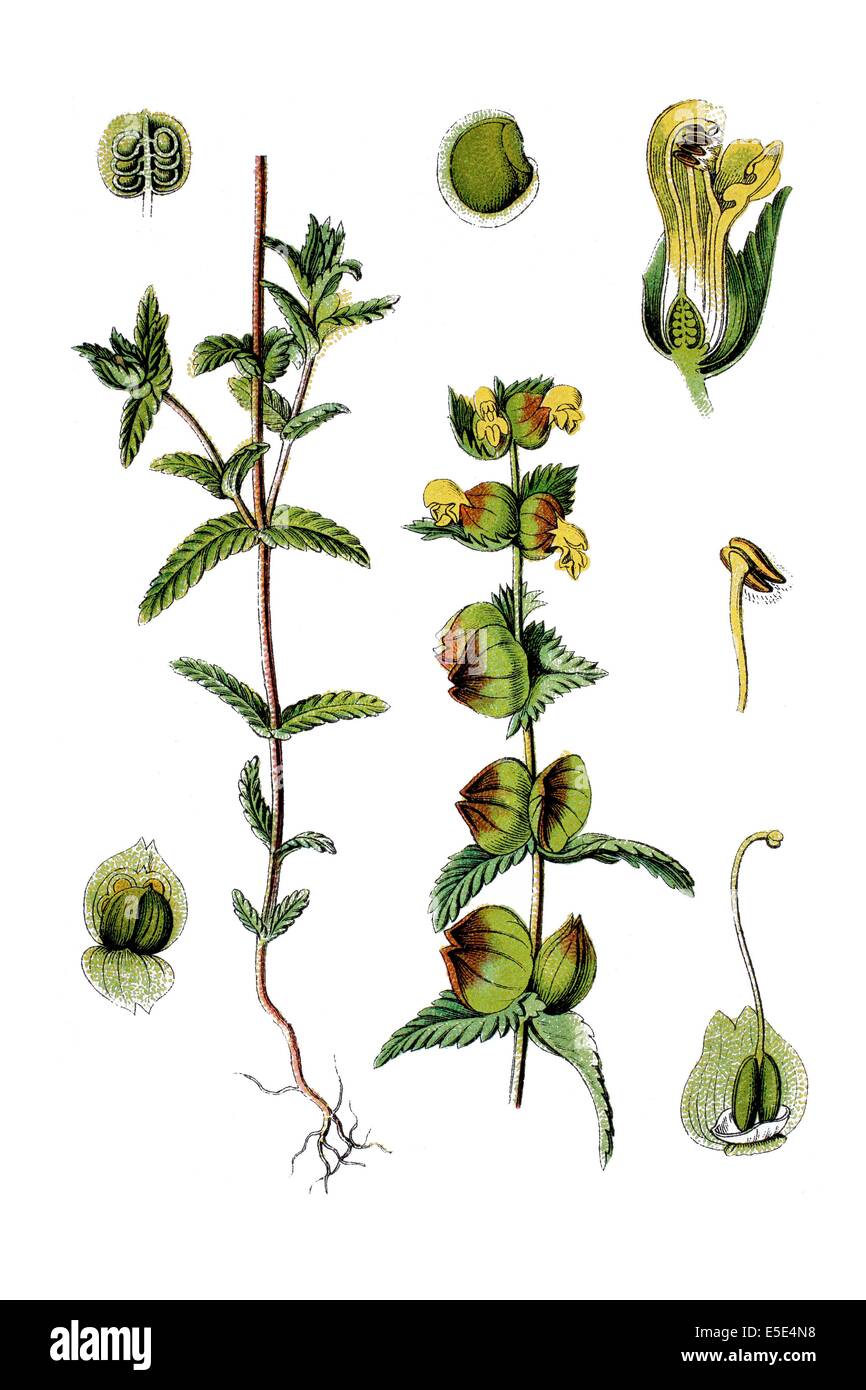 yellow rattle. An annual about 30-50cm tall with simple or branched stems bearing narrowly lance-shaped, nettle-like dark green leaves and tubular, 2-lipped yellow flowers with brown or purple teeth, within a bladdery, inflated calyx, the seeds rattling inside when ripe.