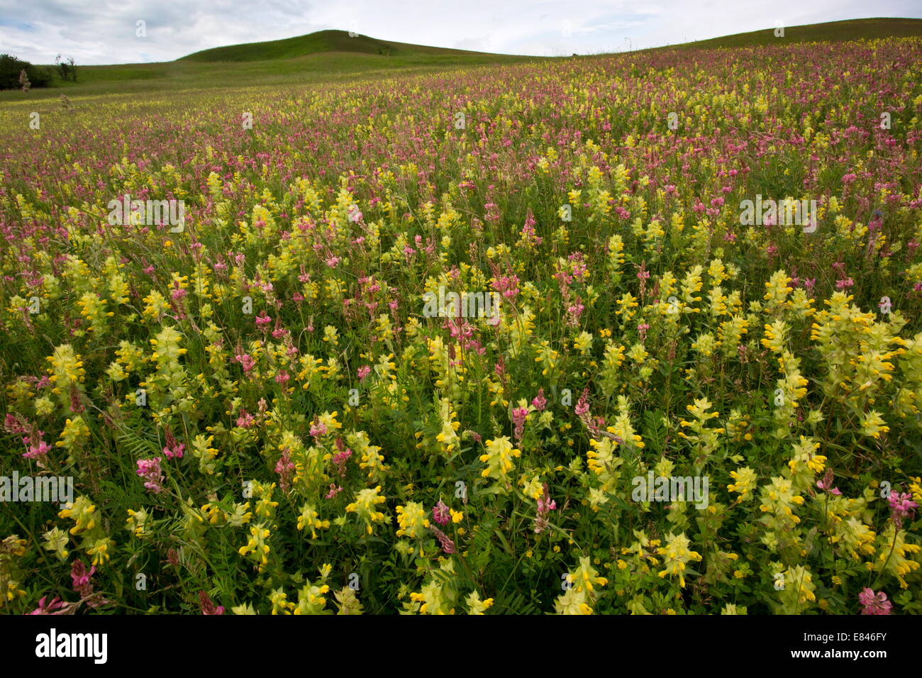 Mass of Yellow Rattle / Hay Rattle mainly Rhinanthus rumelicus with Sainfoin in meadows near
